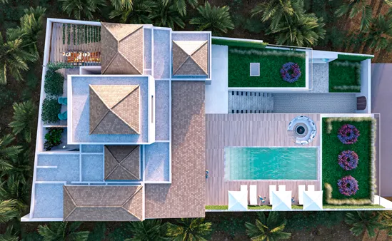 Het Italiaanse Positano is de inspiratie voor Villa Wildflower. Met zijn zachte turquoise en roze tinten, houten details, open keuken en prachtige binnenplaats met een buitenkeuken, ademt de villa rijkdom, comfort en luxe.